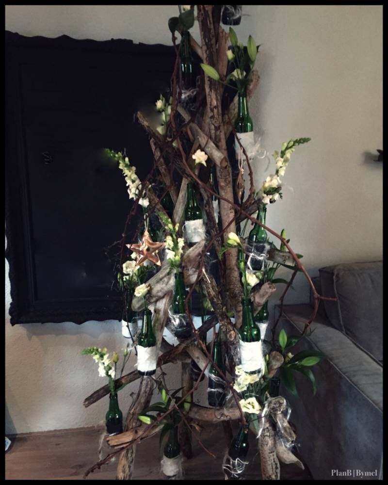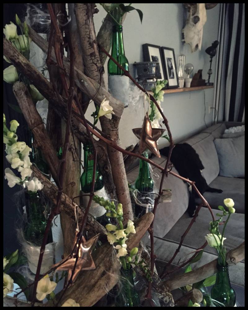 Dit jaar heb ik gekozen om te decoreren met groene flesjes en druiventakken.