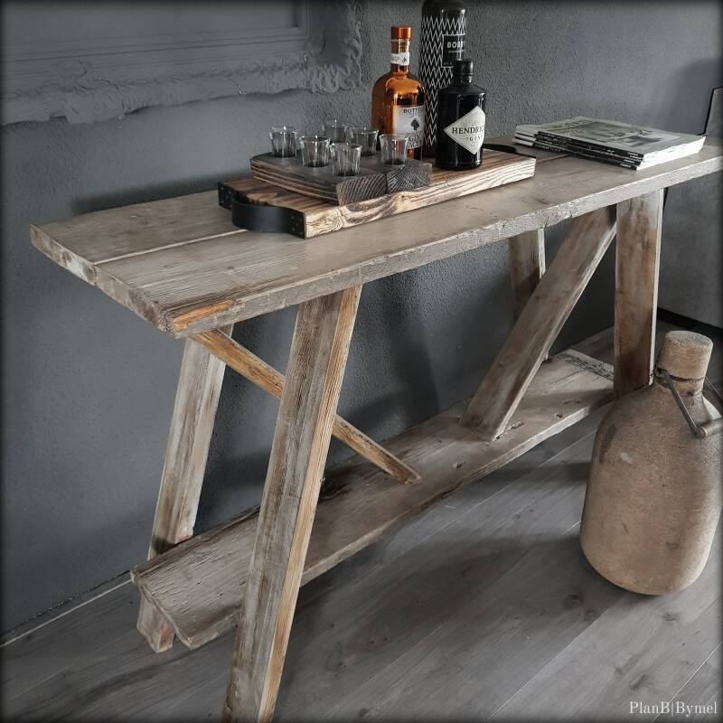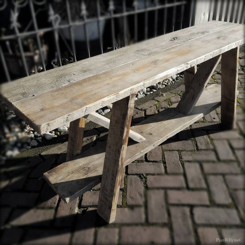 Voor de tafels gebruik ik oude steigerhouten planken die ik naar wens op kleur maak of een oude look geef...
